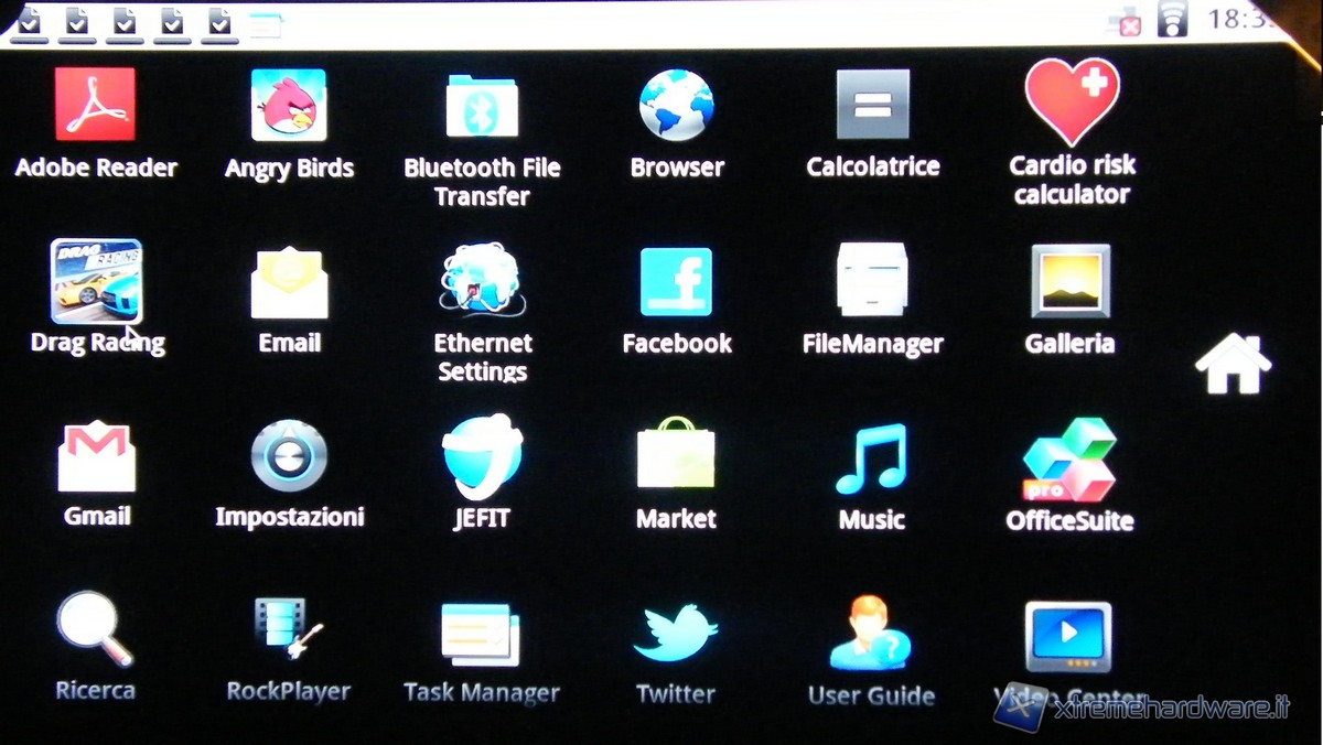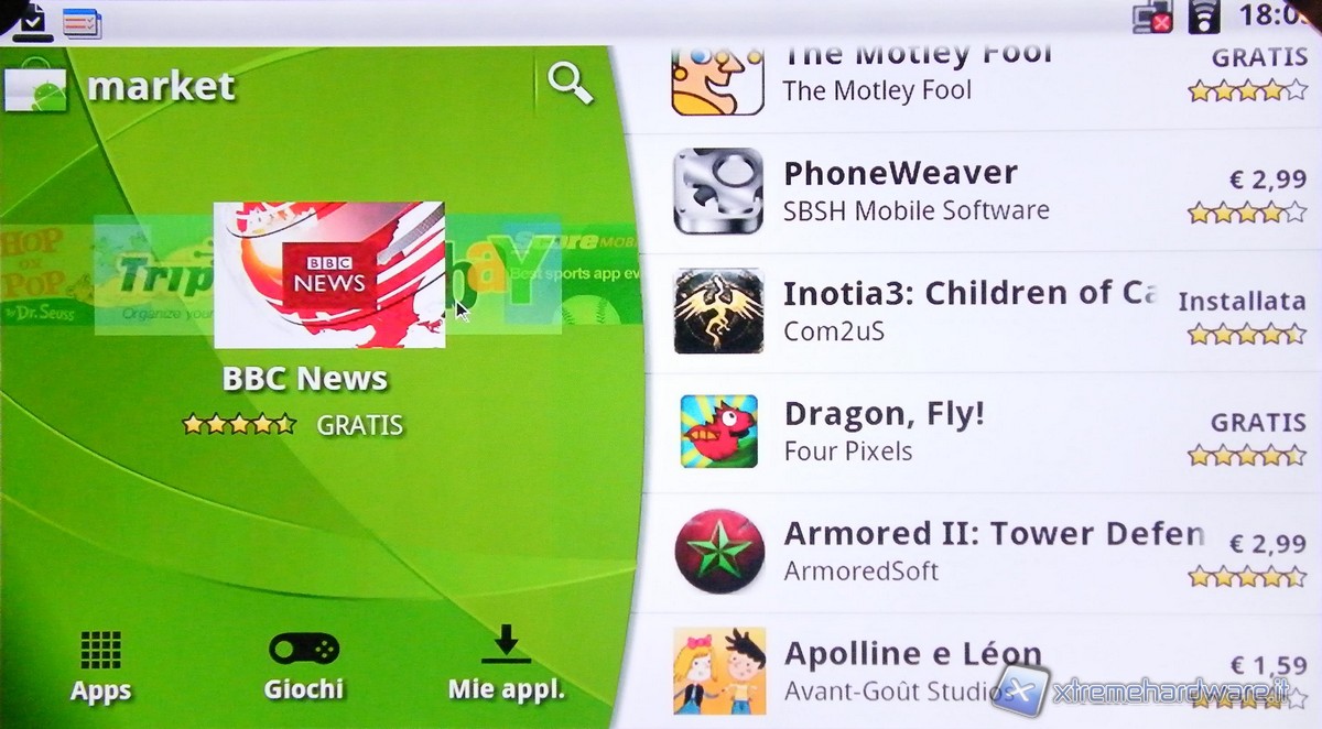 Tra i vari giochi che abbiamo provato c'è stato anche il gioco gratuito Drag Racing. In questo caso l'Air mouse ha qualche limite nel controllo rispetto ai touch screen, soprattutto a causa della presenza di un fisiologico "ritardo" per la necessità di spostare il cursore sullo schermo, ritardo che è ovviamente assente nel caso dei touch screen. Ci è stato possibile comunque provare questo divertente gioco e vincere alcune gare contro avversari online. Brevemente, come sa bene chi è pratico del sistema operativo Android, l'Android Market è una piattaforma online che consente di scaricare vari tipi di applicazioni, che consentono di espandere le funzionalità di Android, personalizzandolo.